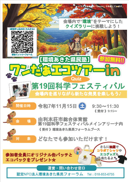 秋田県地球温暖化防止活動推進センターは、11月15日(土)に由利本荘市で開催される「第19回科学フェスティバル」において、環境学習イベント「ワンだぁエコQuizツアー」を実施します。