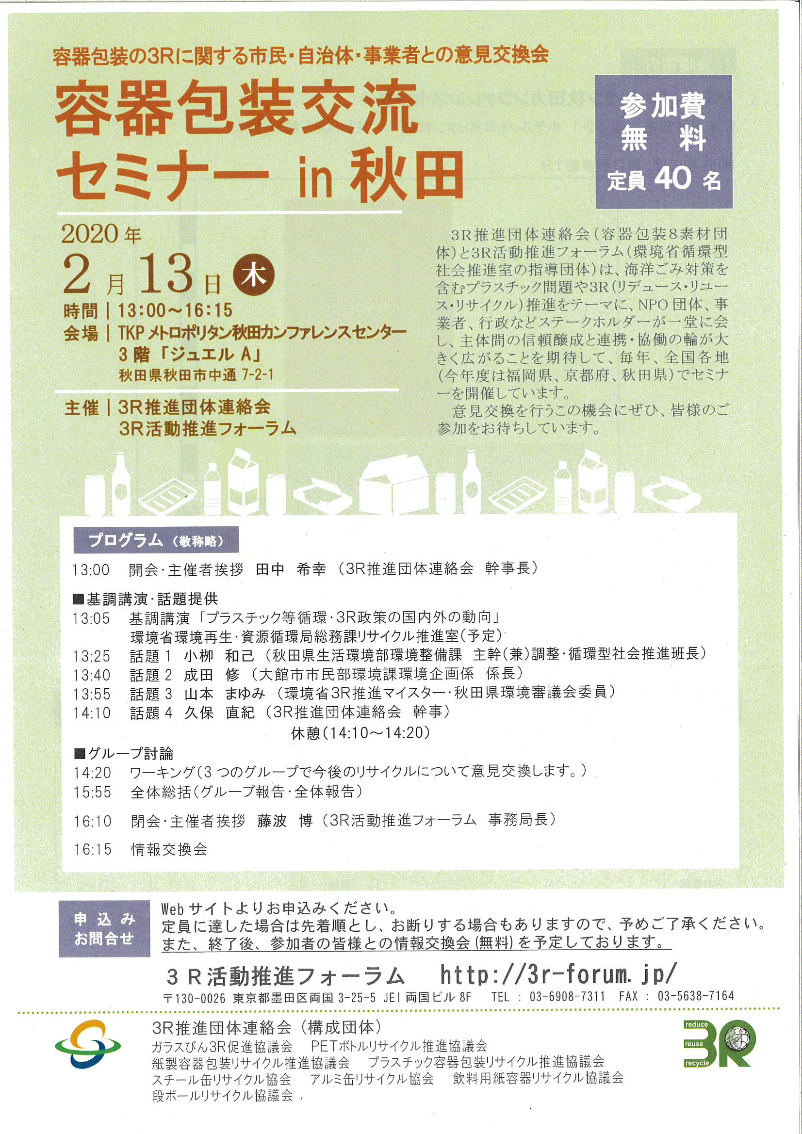 『包装容器交流セミナー』in秋田が3R推進団体連絡会・3R活動推進フォーラムの主催で開催されます。