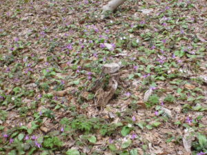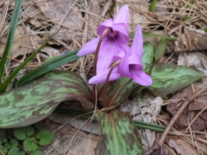 会場の里山はカタクリの群生地で、あたり一面にカタクリの花が咲いていましたが、開花の時期には少し早かったため、花芽がつぼみのものもありました。森の案内人の方から「あと少し経つともっとたくさんカタクリの花が見られるよ」とうかがいました。きっと満開時は一面、紫のじゅうたんみたいに素敵だろうと思いました!その中には時々とても珍しい白いカタクリの花も見られたりするそうです。