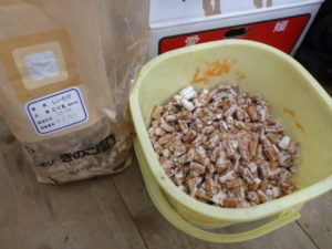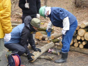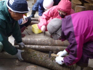 その後、山小屋前で、参加者全員でしいたけやなめこなどのきのこの植菌を行いました。