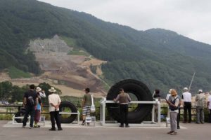 (右の山の所にダム本体が造られる。) (展望台の超大型ダンプのタイヤです。)
