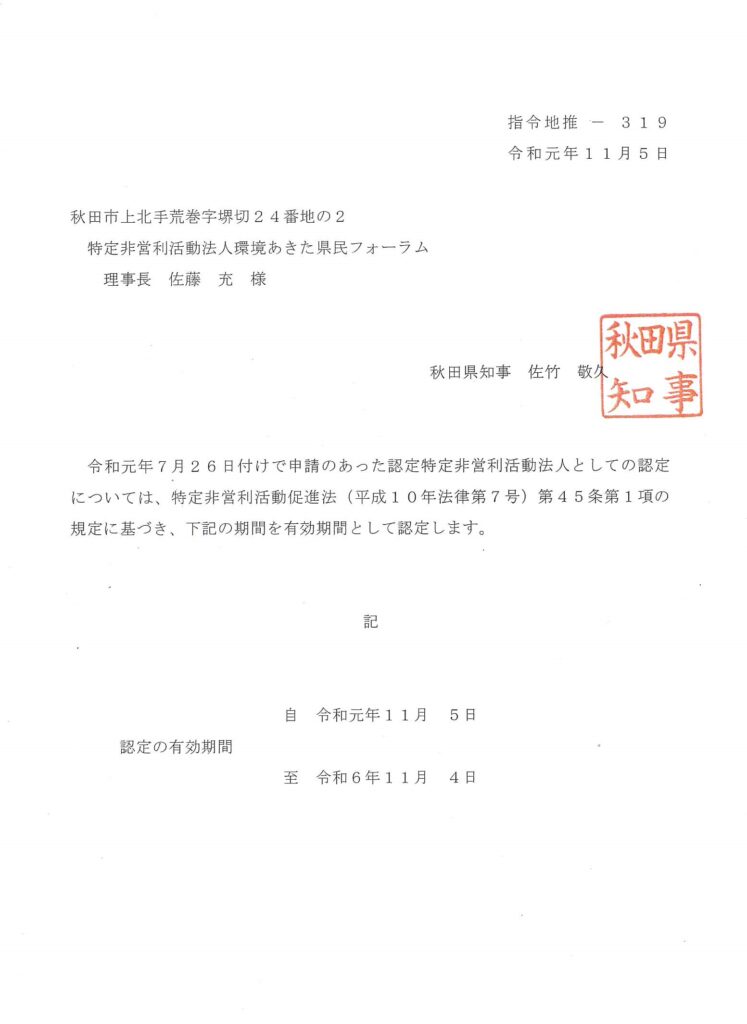 けで、秋田県より「認定NPO法人」として認定されましたのでお知らせします。