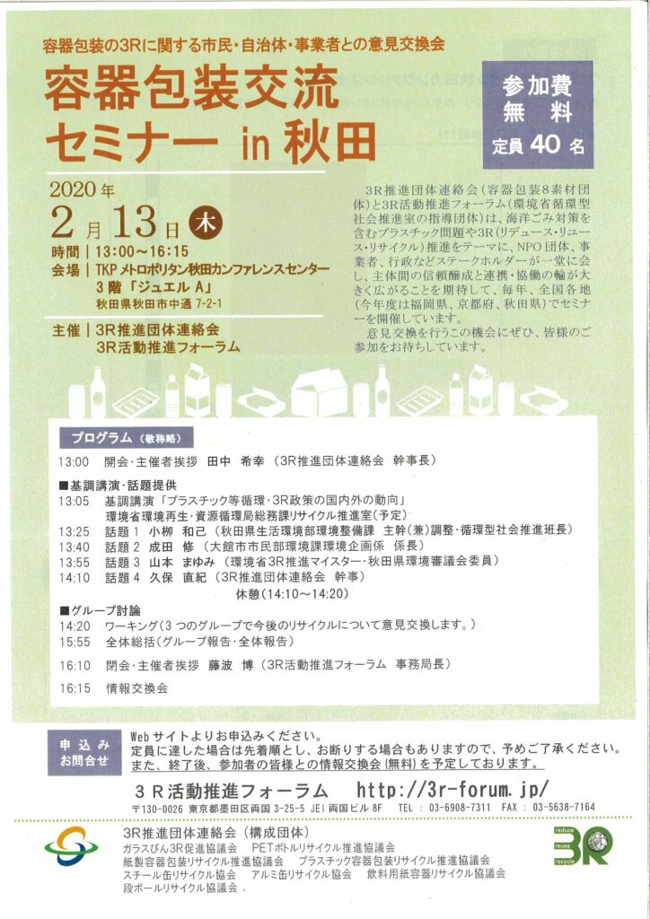 『包装容器交流セミナー』in秋田が3R推進団体連絡会・3R活動推進フォーラムの主催で開催されます。