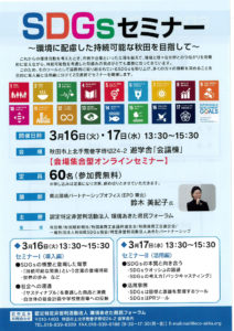 このため、自主事業の一環として、国際的に取り組まれているSDGsを取り上げ、「環境に配慮した持続可能な秋田を目指して」をテーマに導入偏と活用編に分けて下記の通り2日間連続で、セミナーを開催することといたしました。