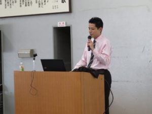 総会終了後、秋田県土地改良事業団体連合会に事務局を置く秋田県農業水利施設活用小水力等発電推進協議会の副主幹 伊藤淳一氏を講師に招き、「秋田県における小水力発電と再生可能エネルギーの導入について」と題して環境講演をしていただきました。最近、再生可能エネルギーへの関心が高まっていますが、今回は農業分野である農業用水路を活用した発電について、身近な秋田県の稲作との関わりにも触れながら伊藤氏から分かりやすく講義頂きました。(写真は伊藤講師)