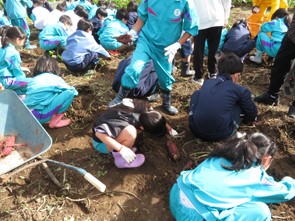 10月18日(水)に秋田市仁井田大野集落に借りた畑で大住小学校3年生と一緒にサツマイモ収穫の農作業体験会を実施しました。この企画は地域の農業愛好者の団体「水土里(みどり)の野菜倶楽部」が毎年実施している企画で、苗植え付け、収穫を子どもたちに体験してもらうものです。