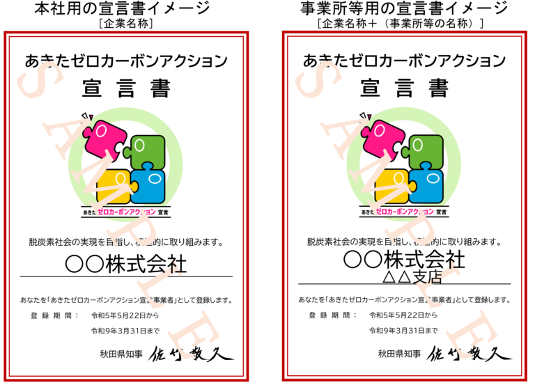 2022年の秋田県のカーボンニュートラル宣言を起点に、2050年カーボンニュートラルの達成に向け、「オール秋田」での機運を盛り上げるべく、節電や節水、省エネ設備の導入等、二酸化炭素削減につながる取り組みを行う「ゼロカーボン(脱炭素)に向けて取り組む企業・団体等」を、秋田県が登録・公表して「見える化」する制度です。登録企業・団体等には県から宣言書が交付されるほか、PRなどで利用できるオリジナルロゴマークを提供しています。