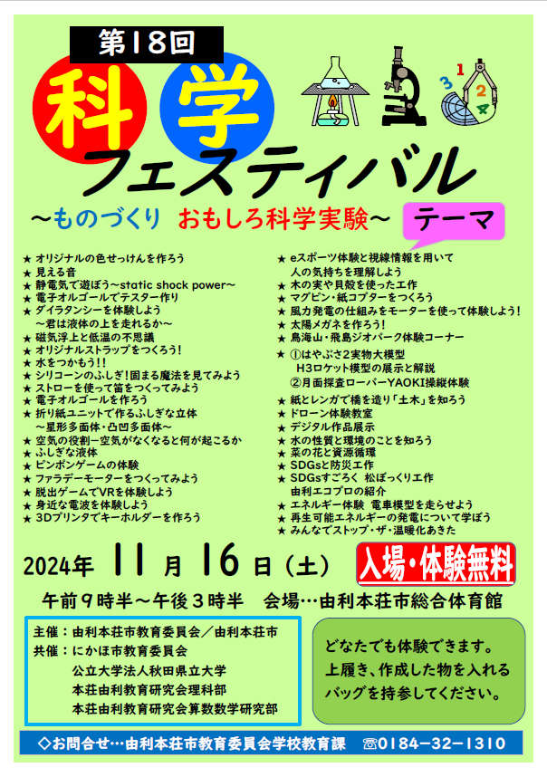 11月16日(土)に、由利本荘市で第18回科学フェスティバルが開催されます。