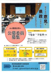 秋田県では、広く県民の皆さまのご意見を県政に反映させるため、審議会等の委員を募集しています。