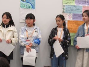 全国エコ活コンクールに応募した壁新聞の内容について各クラブから発表し、お互いに質問したり感想発表を行いました。