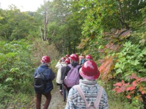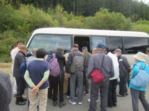 成瀬ダム上流展望台から、全員ヘルメットをかぶり、鹿島建設の現場出入り口用のマイクロバスに乗り込み、鹿島建設の森田さんのガイドのもと、建設現場内を見学しました。