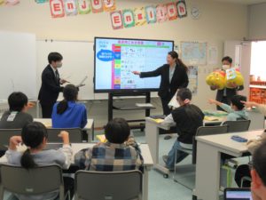 1コマ目冒頭、うんこ先生の登場で盛り上がったあと、うんこドリルのイラストを使ったクイズ形式で授業が進みました。