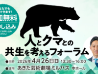 『人とクマとの共生を考えるフォーラム@ミルハス』 あきた芸術劇場ミルハスで「人とクマとの共生を考えるフォーラム」が開催されます! 【日時】 令和8年4月26日(日) 13時30分~16時00分 (12時30分から開場・受付開始) 【場所】 […] このページをシェアする お知らせ 2026年4月8日