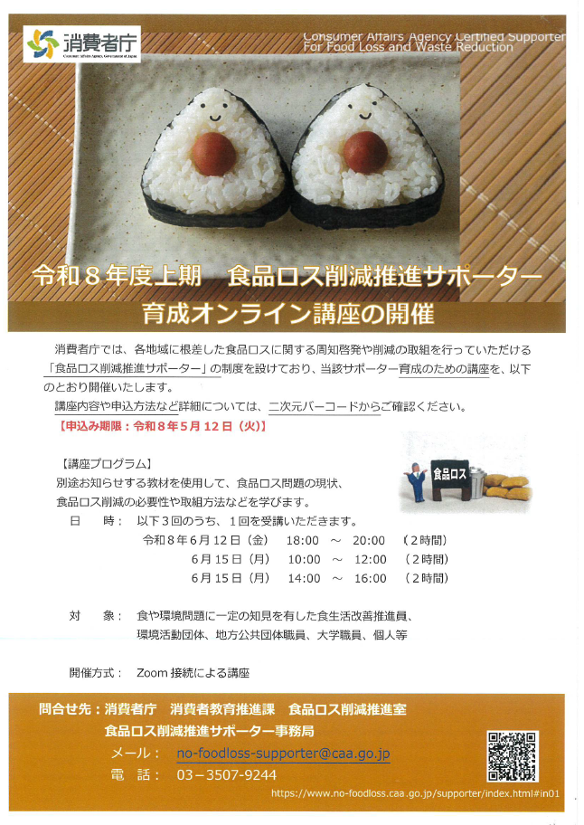 消費者庁では、各地域に根差した食品ロスに関する周知啓発や削減の取組みを行っていただける「食品ロス削減推進サポーター」の制度を設けており、その育成のための講座を、以下のとおり開催いたします。