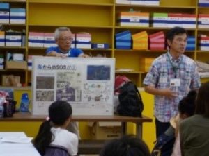 工藤会長の挨拶後、「海洋ゴミについて」「環境紙芝居」の座学を実施しました。あきたエコマイスター県央協議会の活動や会のマークの由来「緑、青、白は秋田の大地、空、雲を表す。秋田の自然を大切に守っていきたいとの思いで作られた」ことも紹介できました。