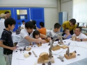その後、会場を移動し工作づくりです。親子で話し合い楽しそうに工作を作り上げる様子を見ることができました。思い通りに作れない時はエコマイスターの出番!「木と木をつなげてほしい」などのお願いに素早く対応、接着剤や工具を使った接ぎ木の仕方をじっと見ている子どももいました。