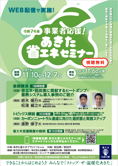 ・秋田県公式ウェブサイト『「事業者応援!あきた省エネセミナー」(オンライン)を開催します!』
