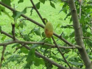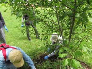 ピクニック広場のプルーンの木について、初めて今年花が咲いて興奮しながら5月に前回報告したところですが、今回は1個プルーンに実があるのを見つけました。証拠の写真はとりました。が、その2,3日後天気が続いたので水やりに寄ったところ実は見えなくなっていました。幹の根元を見たらプルーンの実は青いまま落ちていました。鳥などにつつかれたのか、まだ木に十分な栄養がなく落ちてしまったのかなと考えています。栄養を与え木に体力をつけて来年に期待したと思っています。