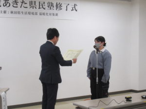 修了式には、大仙市の伊藤市民部長、三浦生活環境課長、あきたエコマイスター県南協議会の藤原会長に来賓としてご出席いただき、秋田県の田口温暖化対策課長から修了生代表に修了証書が授与されました。
