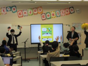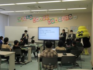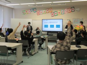 1コマ目冒頭、うんこ先生の登場で盛り上がったあと、うんこドリルのイラストを使ったクイズ形式で授業が進みました。