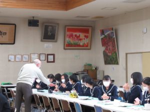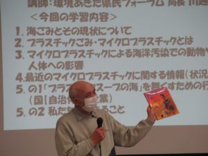3月1日(月)に由利本荘市立西目中学校で、1年生の総合的な学習の時間を利用して「プラスチックゴミによる海洋汚染」という演題で、生徒さんたちにとって身近で大事な地域の自然環境である海洋汚染について一緒に勉強しました。