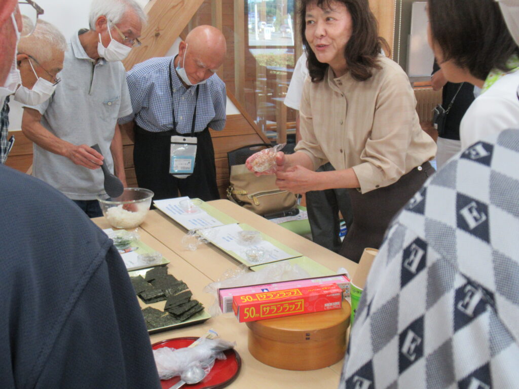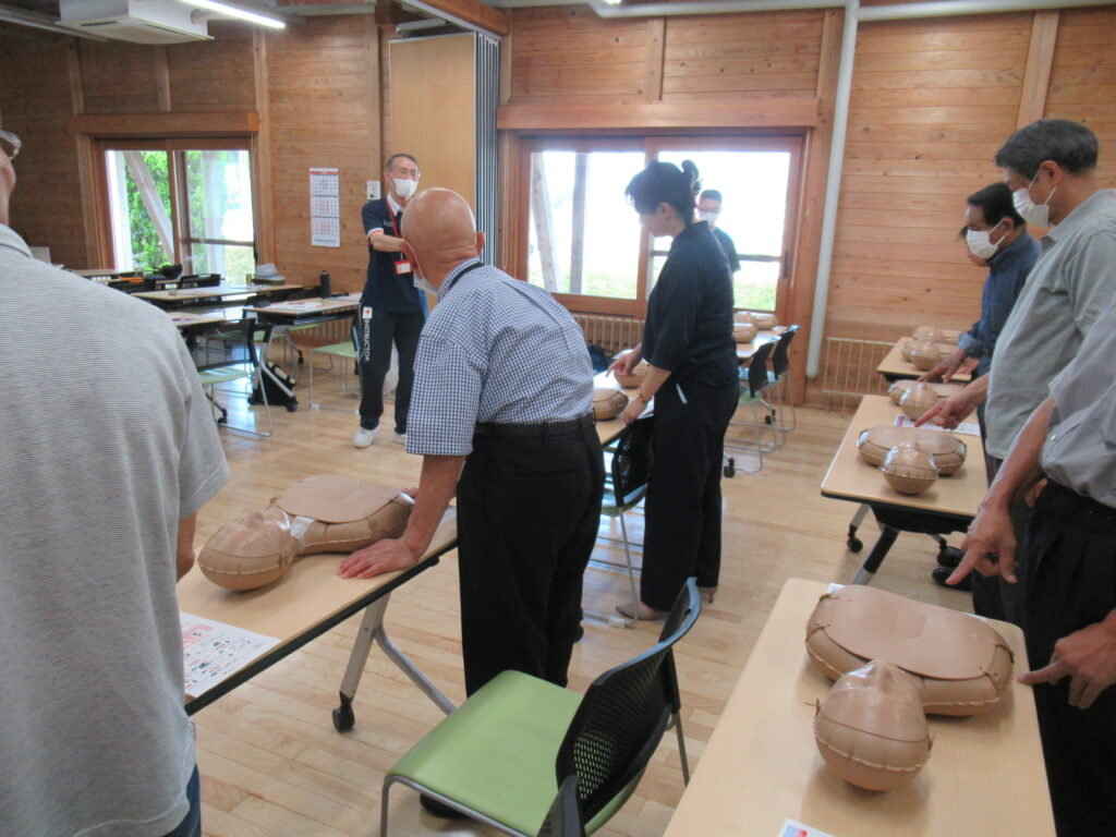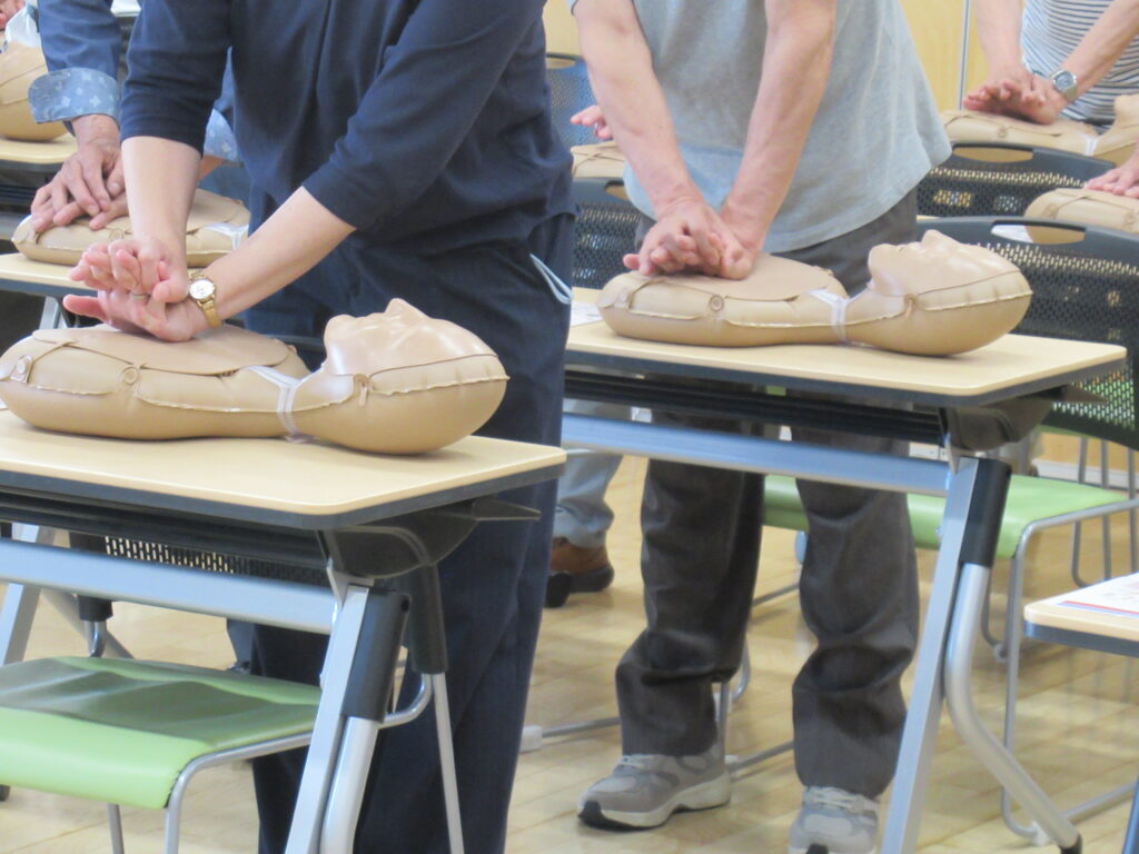 心肺蘇生法の胸骨圧迫の練習では、正しい強さで胸部を押すと人形から音が鳴る仕組みでした。しかし、受講された皆様は「なかなか音が鳴らない!」と、力の入れ具合に苦戦されている様子でした。また、おにぎり作りでは、夏バテに効果的な食材について学んだ後、試食を楽しまれました。和やかな雰囲気の中、知識を深める良い機会となりました。