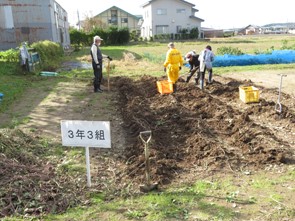 10月18日(水)に秋田市仁井田大野集落に借りた畑で大住小学校3年生を対象にしたサツマイモ収穫の農作業体験会を実施しました。この企画は地域の農業愛好者の団体「水土里(みどり)の野菜倶楽部」が毎年実施している企画で、苗植え付け、収穫を子どもたちに体験してもらうものです。