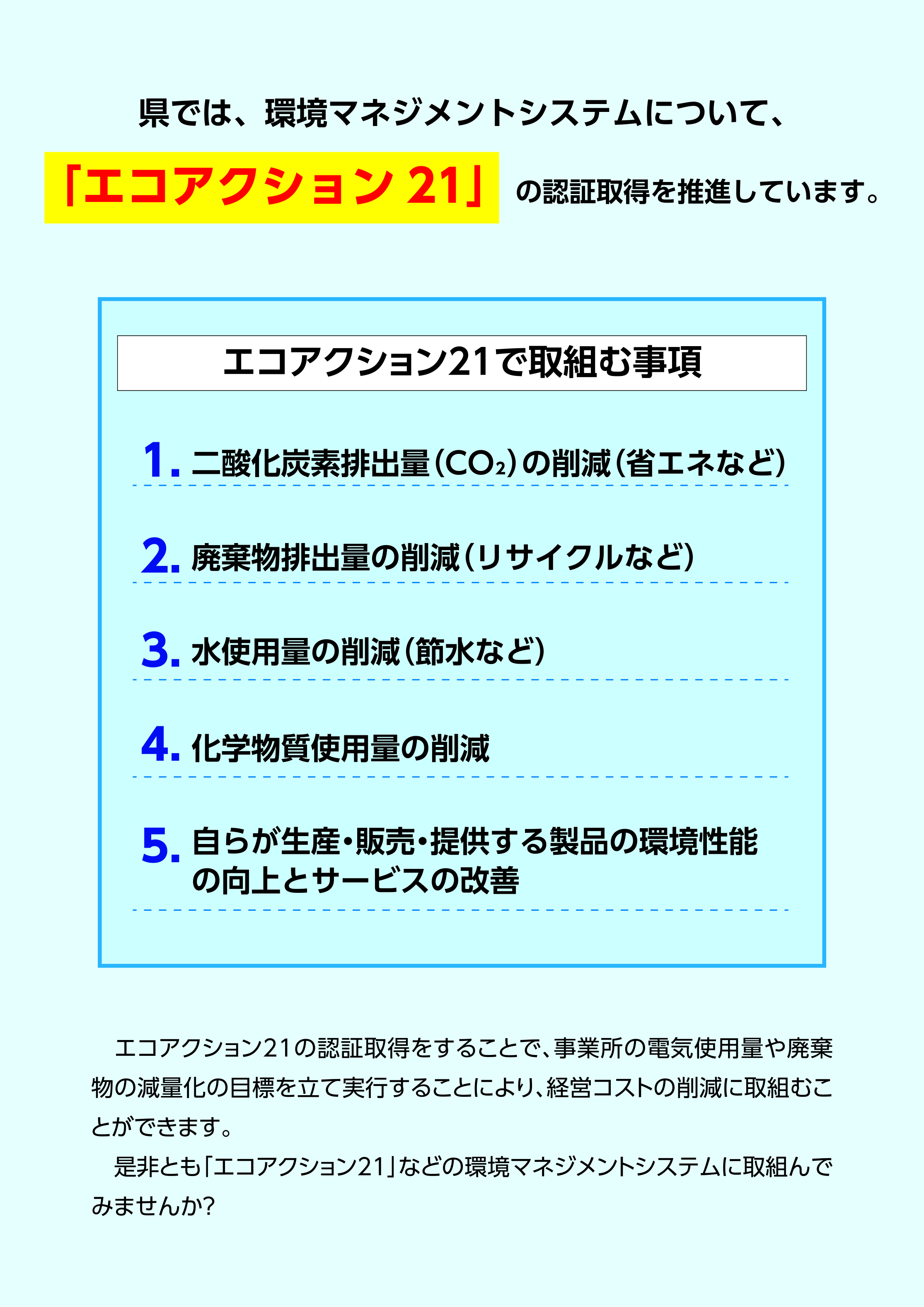 企業や団体が環境への影響を減らし、持続的に改善していくための仕組みである環境マネジメントシステムの普及を進めています。