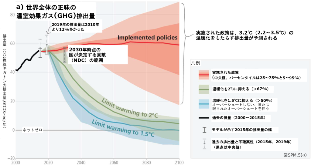 温暖化を1.5℃又は2℃に抑えるには、この10年間に全ての部門において急速かつ大幅で、ほとんどの場合即時の温室効果ガスの排出削減が必要であると予測される。世界の温室効果ガス排出量は、2020年から遅くとも2025年までにピークを迎え、世界全体でCO2排出量正味ゼロは、1.5℃に抑える場合は2050年初頭、2℃に抑える場合は2070年初頭に達成される。