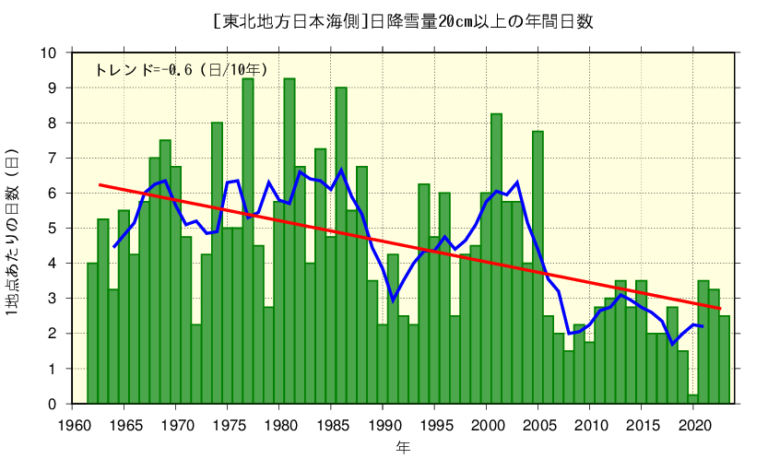 東北地方日本海側の4地点の日降雪20cm以上の年間日数は、減少しています(信頼水準99%以上で統計的に有意)。