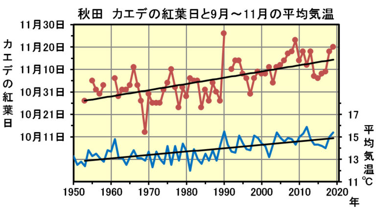 【秋田への影響② カエデの紅葉日の推移】