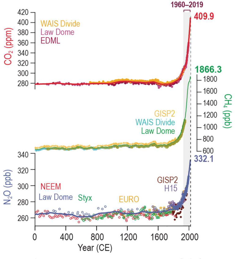 人間活動によって増加した主な温室効果ガスには、二酸化炭素、メタン、一酸化二窒素、フロンガスがあります。