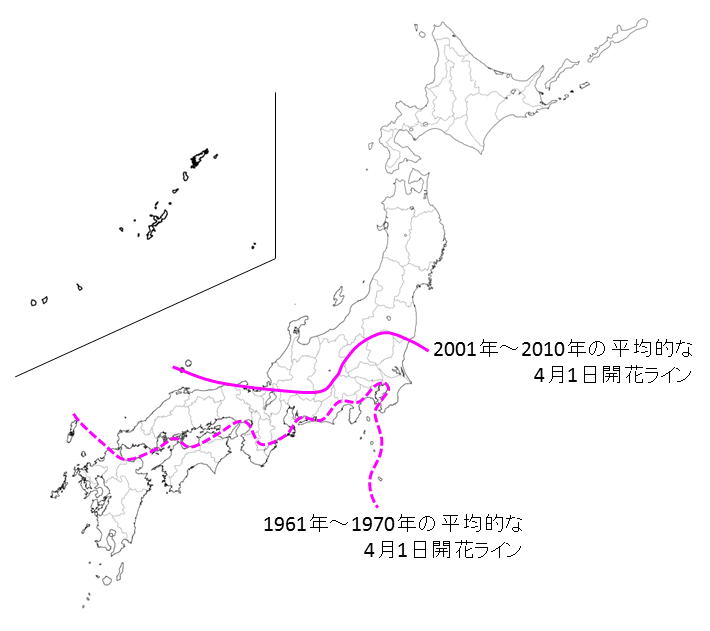 全国的に桜の開花日が早くなってきており、東北でも1953年以降10年あたり約1.0日の変化率で早くなっています。