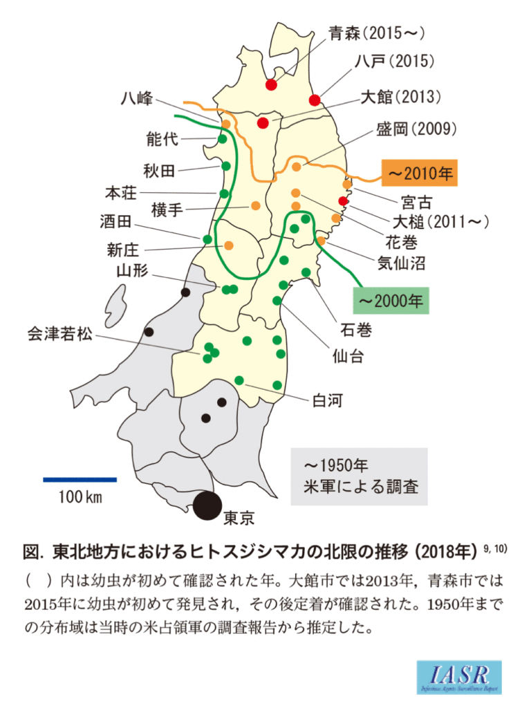 デング熱などを媒介するヒトスジシマカ(やぶ蚊)の分布は年々、北上しています。